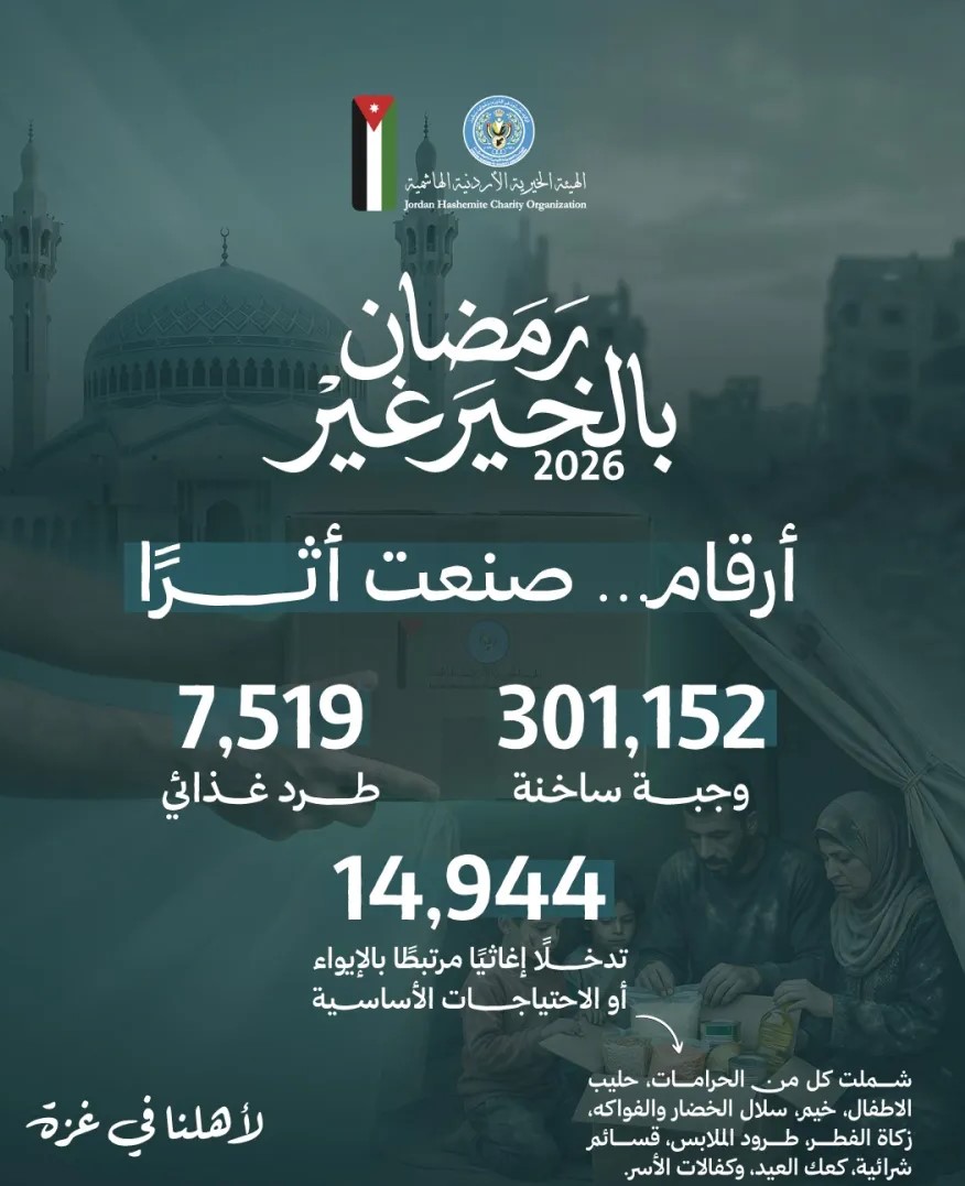 القمة الأردنية-السعودية-القطرية تعزز وحدة الموقف العربي وتعكس رؤية مشتركة للأمن الإقليمي جمعية الفنادق الأردنية تثمن قرارات الحكومة بدعم قطاع السياحة الأمم المتحدة تحذر: خسائر الدول العربية من العدوان على إيران قد تصل إلى 200 مليار دولار لافروف: امريكا وإسرائيل تحاولان تأليب الدول الخليجية ضد إيران.. ونحذر من تصاعد الازمة الى صراع اكبر أكثر من 5500 إسرائيلي بلا مأوى اليوم دمرت منازلهم الصواريخ الايرانية المنطقة العسكرية الجنوبية تحبط محاولتي تهريب مواد مخدرة بواسطة طائرتين مسيرتين إجراءات ترشيد الطاقة: بداية جيدة، لكن الحاجة الحقيقية هي إلى انضباط وطني أوسع في إدارة الطاقة "الوطنية للأسرى والمفقودين" تستنكر تشريع الاحتلال الصهيوني لـ"اعدام الاسرى" الصين تدعو إلى وقف فوري للعمليات العسكرية في الشرق الأوسط ارتفاع أسعار الذهب في الأردن اليوم الثلاثاء مقتل 4 جنود إسرائيليين واصابة اخرين بكمين لحزب الله الخيرية الأردنية تختتم حملة "رمضان بالخير غير" بتنفيذ واسع في الأردن وغزة جمعية الفنادق: الحكومة تمنح قروضًا مدعومة للفنادق والمنشآت السياحية التربية تمدد فترة تسجيل لامتحان الثانوية العامة للعام 2026 كنعان: قانون إعدام الأسرى يعكس نهج أبرتهايد إسرائيلي ويشكل ضربة لمنظومة حقوق الإنسان انقلاب شاحنة على طريق الضليل باتجاه الزرقاء يسبب أزمة مرورية الاستثمار الأجنبي في الأردن ينمو 25% إلى أعلى مستوى منذ 2017 مناشدة إنسانية لدولة رئيس الوزراء بالأسماء .. مناطق بلا كهرباء اليوم من 9:30 صباحًا حتى 3 عصرا بالأسماء .. مؤسسة التدريب المهني تدعو مرشحين لإجراء المقابلات الشخصية