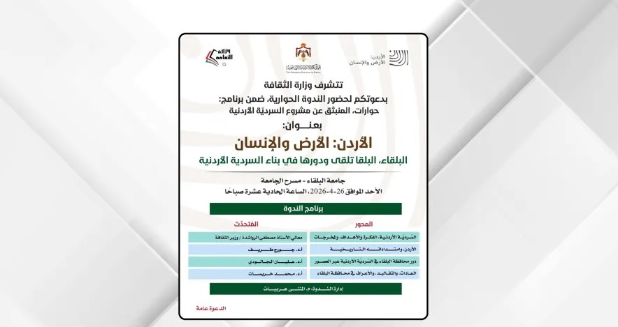 التنفيذ القضائي يحذّر من تجاهل التبليغات القانونية ويدعو للمتابعة الفورية الذكرى السنوية الثالثة لرحيل رئيس الوزراء الأسبق مضر بدران وفاتان و19 إصابة في حوادث سير متفرقة على الطرق الخارجية خلال 24 ساعة نادي قادش الإسباني يوجه رسالة دعم للنشامى قبل كأس العالم 2026 بالأسماء .. فصل التيار الكهربائي عن مناطق في المملكة اليوم 2459 طنا من الخضار ترد السوق المركزي اليوم إصابة شخص بعيار ناري إثر مشاجرة في النزهة أجواء لطيفة اليوم وارتفاع تدريجي على الحرارة حتى السبت وفاة وإصابة 4 أشخاص بحادث سير مروع على الطريق الصحراوي باتجاه العقبة هيئة النقل:طرح 35 خط نقل عام جديد في الزرقاء والمفرق وجرش لتعزيز الخدمة اللواء الركن الحنيطي يستقبل رئيس هيئة أركان الدفاع الإسباني ساعات حاسمة قبل انتهاء مهلة ترامب غدا.. ايران لم تقرر المشاركة بالمفاوضات فهل تعود الحرب؟! هكذا ردت الناطقة باسم الخارجية الروسية على اتهامات النازي نتنياهو ضد ايران ترامب يعبر عن مفاجأته من الصين.. وقرصنة سفينة ايرانية تتهم بحمل مواد كيماوية للصواريخ ادارات الضمان .. وقرارات الحكومات عودة الحياة الديمقراطية 1989: حِكمة الحسين، ثنائية "بدران - بن شاكر"، والدور الريادي لمروان المعشر الملكة رانيا تلتقي مجموعة من رواد الأعمال وتزور مبادرة "عزوتي" في الطريق إلى "بكين 2"...لبنان ساحة تعاون بدل الصراع بين الرياض وطهران ولي العهد يؤكد دعمه وثقته بالمنتخب الوطني لكرة القدم تناقضات واشنطن: ترامب يهدد ايران بعودة الحرب وان لا تمديد للهدنة.. والناطقة باسمه: بتنا قريبين من التوصل لاتفاق مع طهران