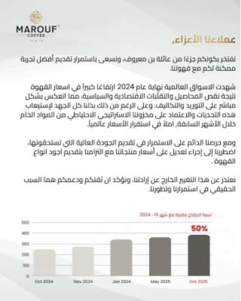 "بن معروف" عن زيادة أسعار القهوة لديها، مرجعاة القرار إلى ارتفاع