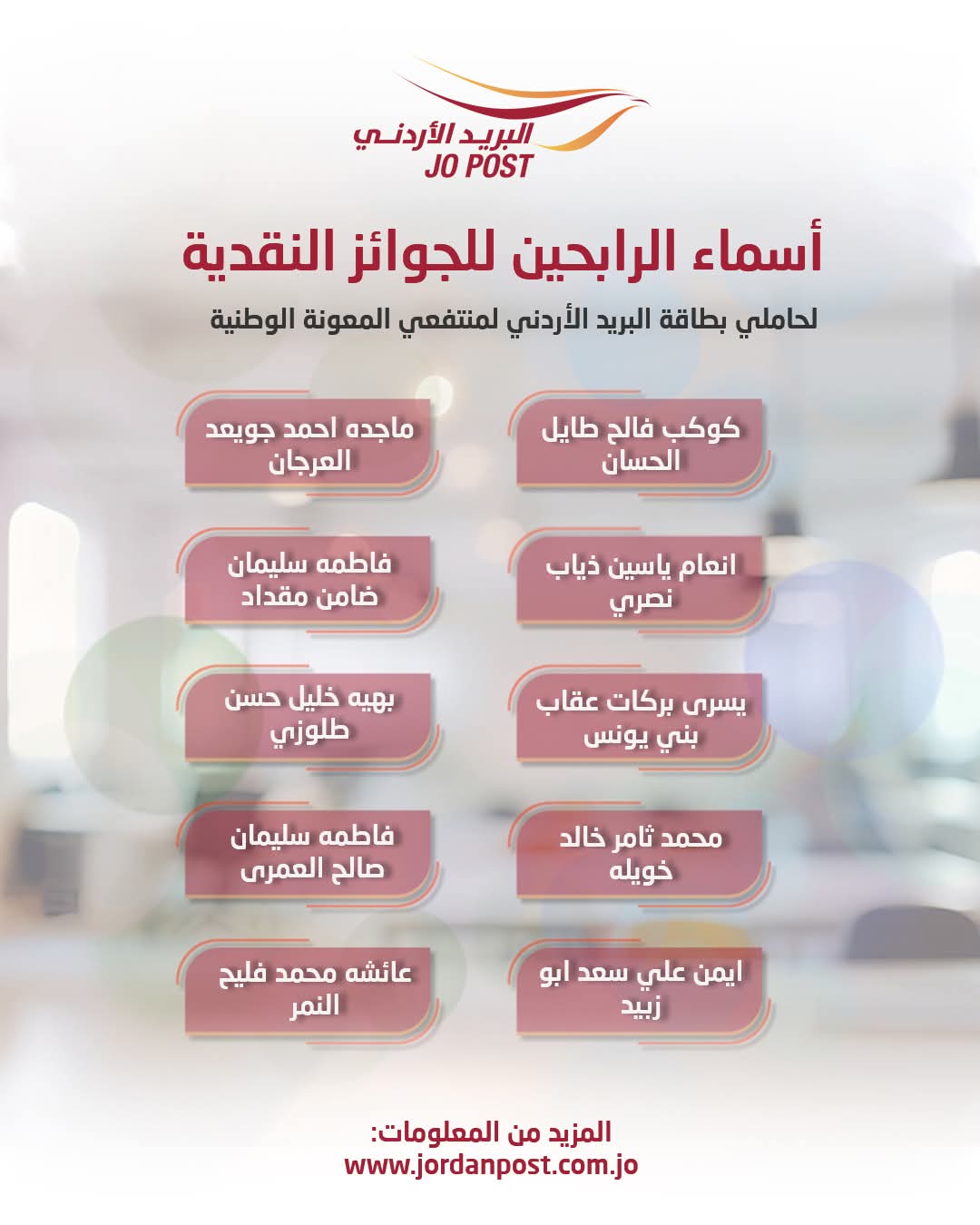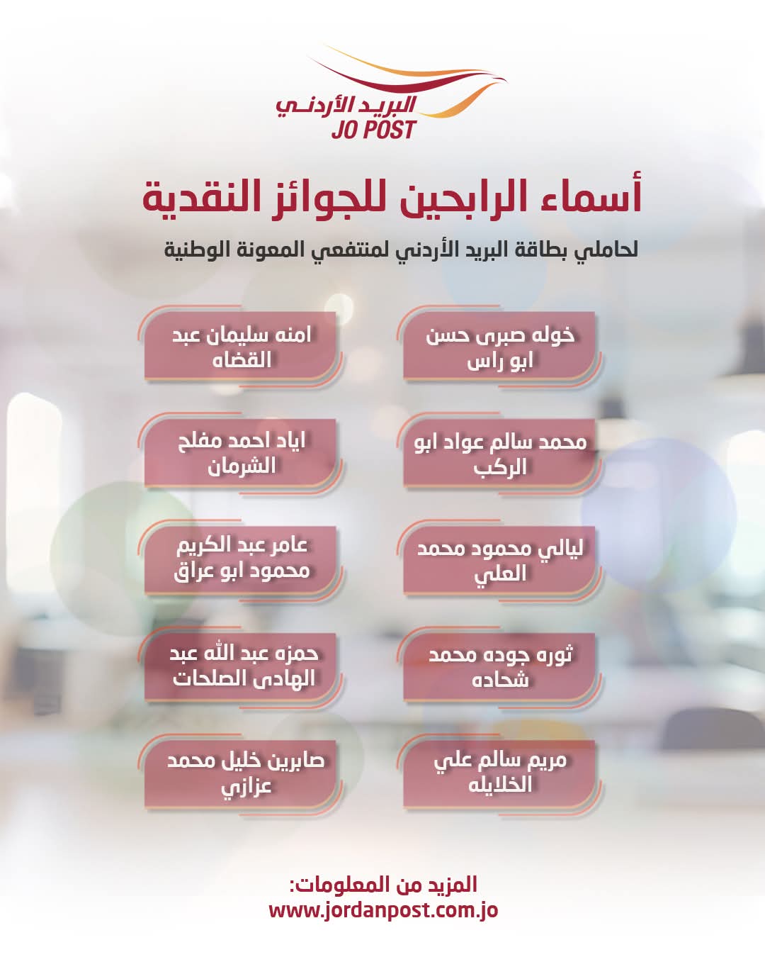 اسماء الفائزين بالجوائز النقدية من حاملي بطاقة البريد الاردني