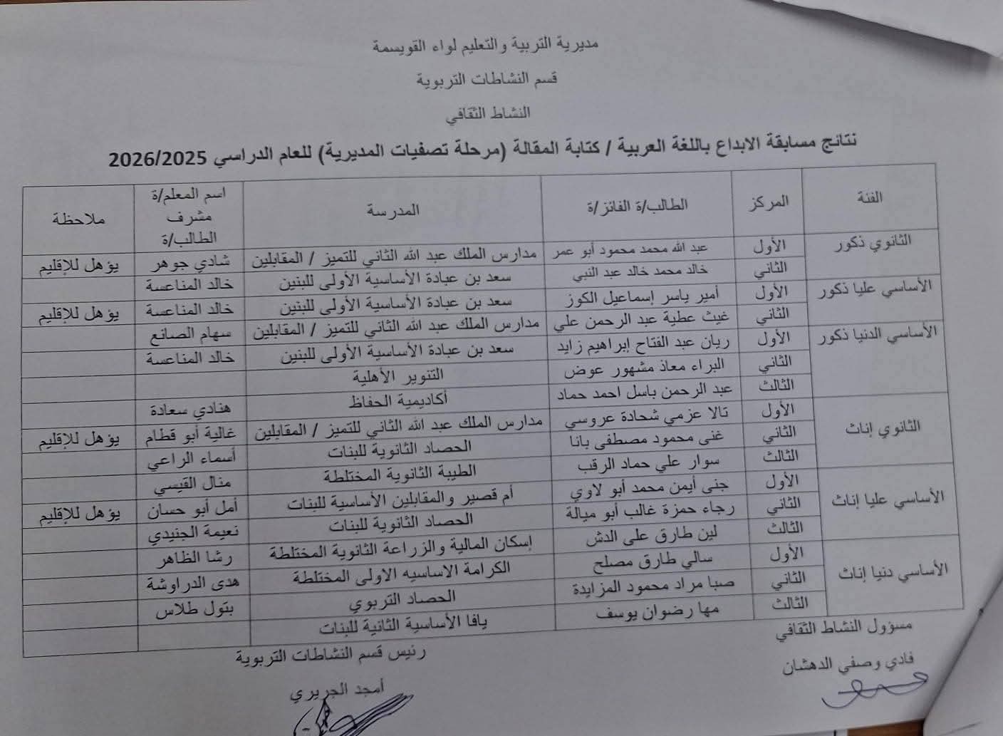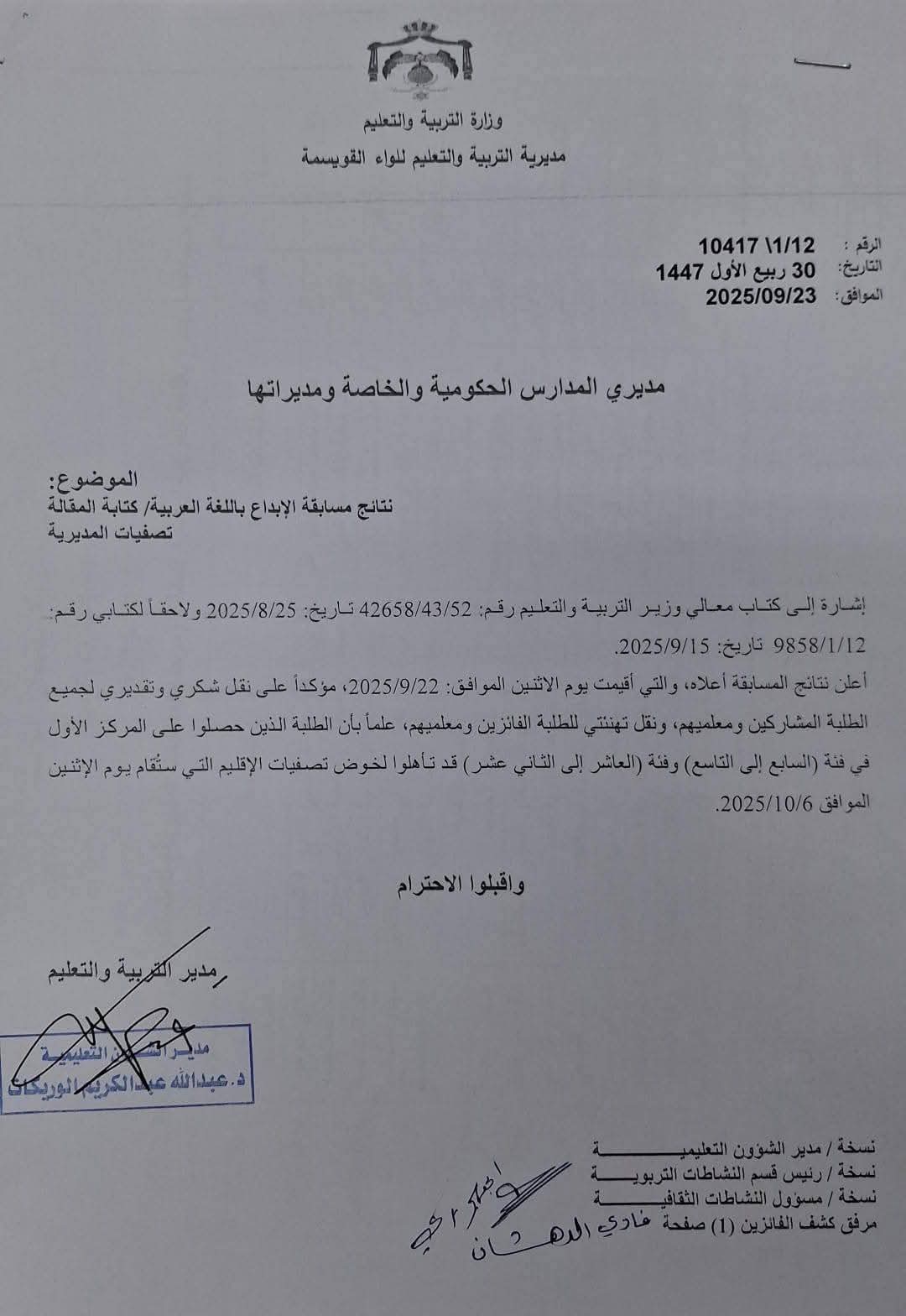 تربية القويسمة بتقصيرها امس الاثنين بترك طلبة متميزين فائزين بالمرتبة الاولى