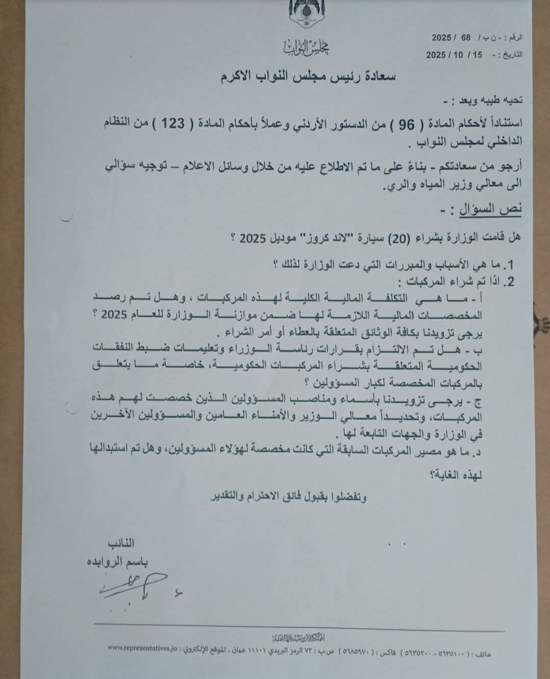 سؤالًا نيابيًا إلى الحكومة، استنادًا إلى أحكام المادتين (96) من الدستور و(123)