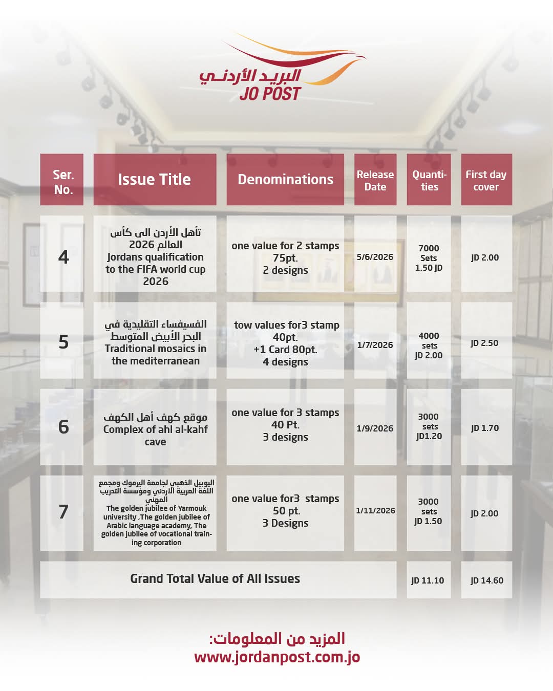 أعلن البريد الأردني عن خطة إصدارات الطوابع التذكارية لعام 2026 والتي تتضمن مجموعة مميزة من الطوابع التي توثّق أحداثًا ومحطات خالدة من تاريخ وثقافة وحضارة الاردن