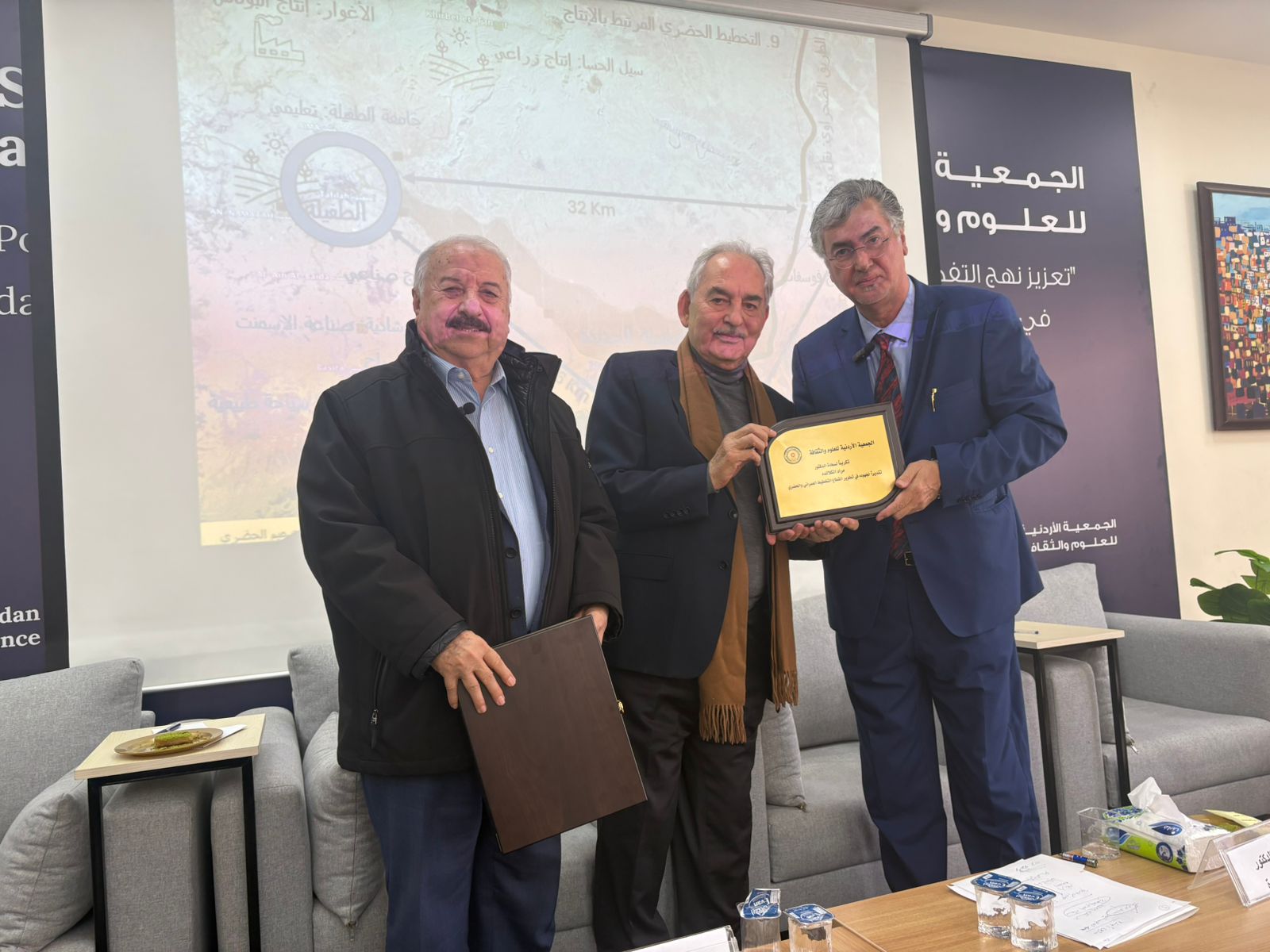 الجمعية الأردنية للعلوم والثقافة المحاضر د. الكلالدة بتقديم درع الجمعية له.