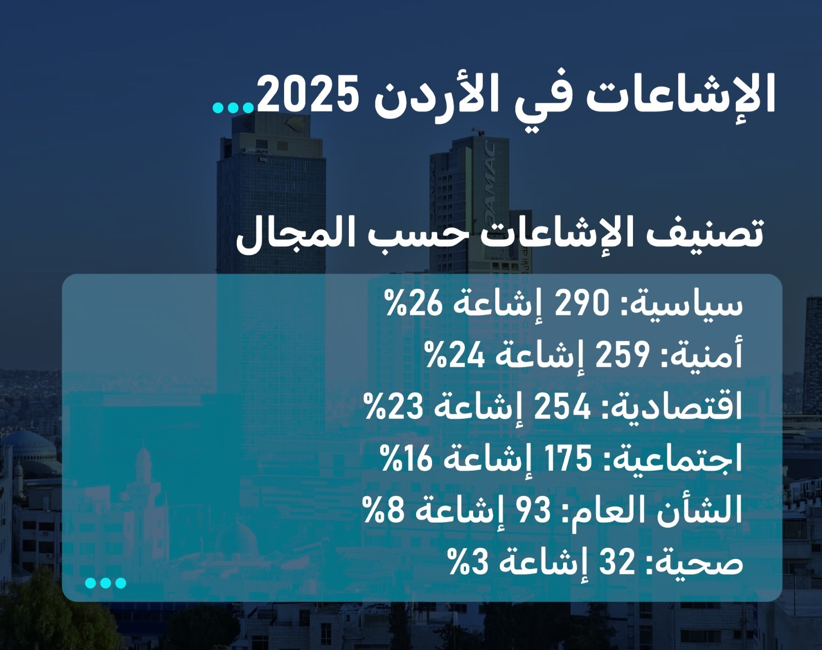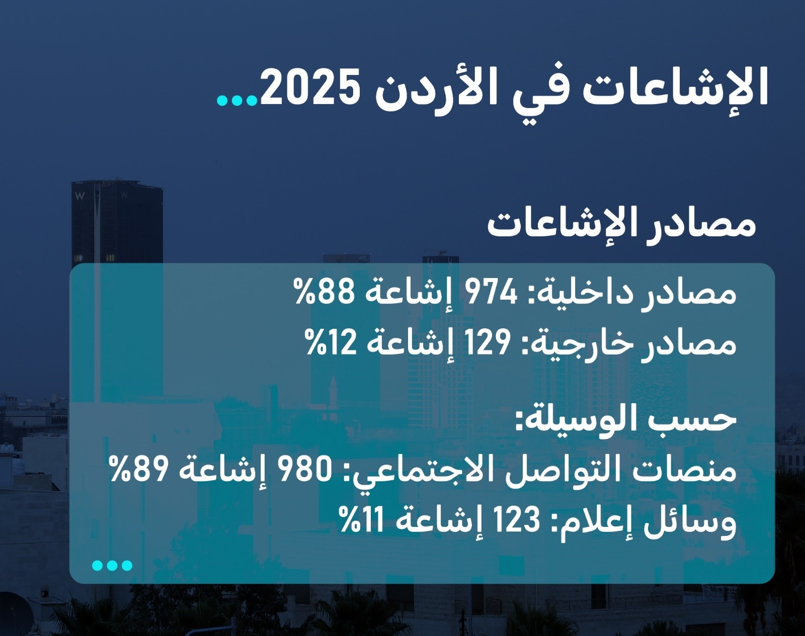 مل عام 2025 للأردنيين 1103 إشاعات على مدار 12 شهرا، بمعدل 92 إشاعة شهريا، و3 يوميا، بحسب تقرير مرصد مصداقية الإعلام الأردني (أكيد)، بيد أن الأردن واجه حرب الإشاعات ببث الوعي وتدفق المعلومات أولا بأول إلى الجمهور لحمايتهم من كل هذا الزيف.