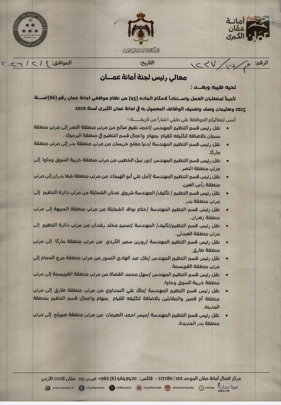 جاء ذلك تأمينا لمتطلبات العمل واستنادا لاحكام المادة 45 من نظام موظفي أمانة نعمان رقم 86 لسنة 2025 وتعليمات وصف وتصنيف الوظائف المعمول به في امان عمان الكبرى لسنة 2020.