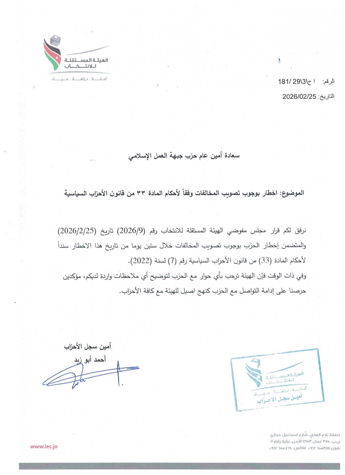 الى حزب جبهة العمل الاسلامي بوجوب تصويب المخالفات وفقا لاحكام المادة 33 من