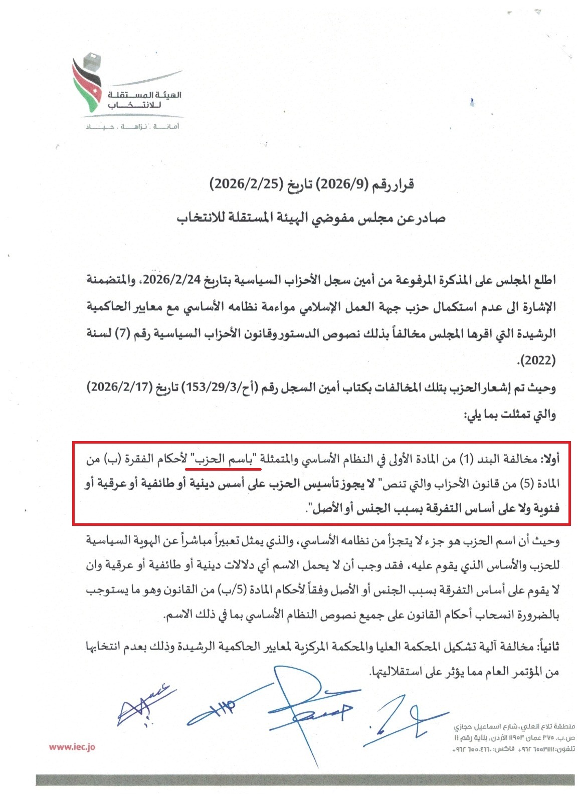 الهيئة المستقلة تطالب حزب جبهة العمل الإسلامي بتغيير اسمه بشكل "رسمي"