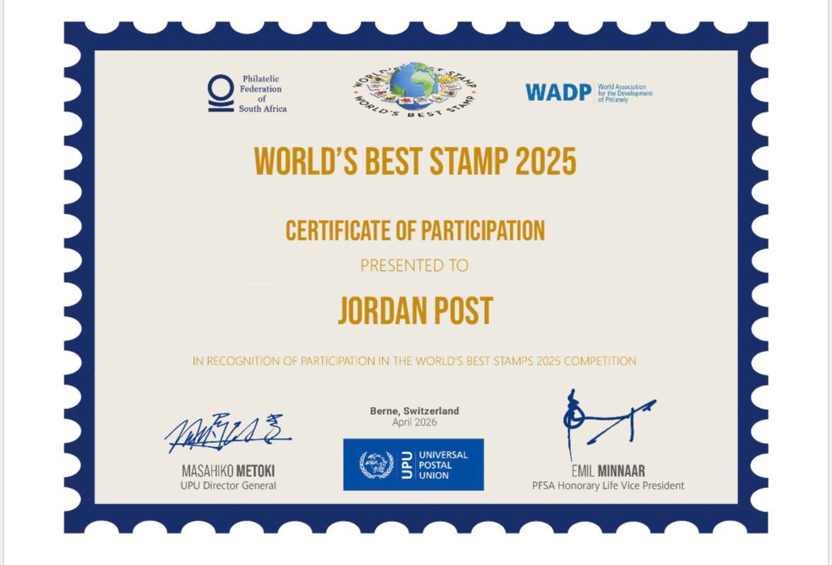 حصول البريد الأردني على شهادة "أفضل طابع في العالم” الرسمية، وهي شهادة مرموقة